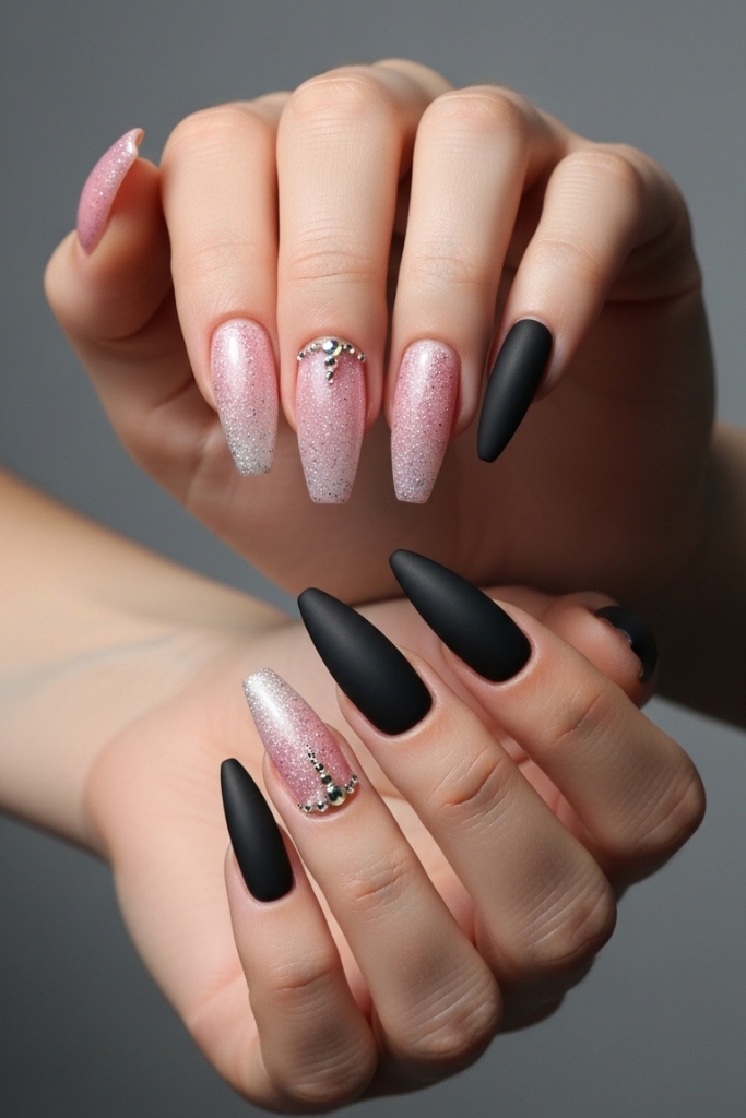 Mix glitter, matte finishes, and bold color contrasts to balance both energies.