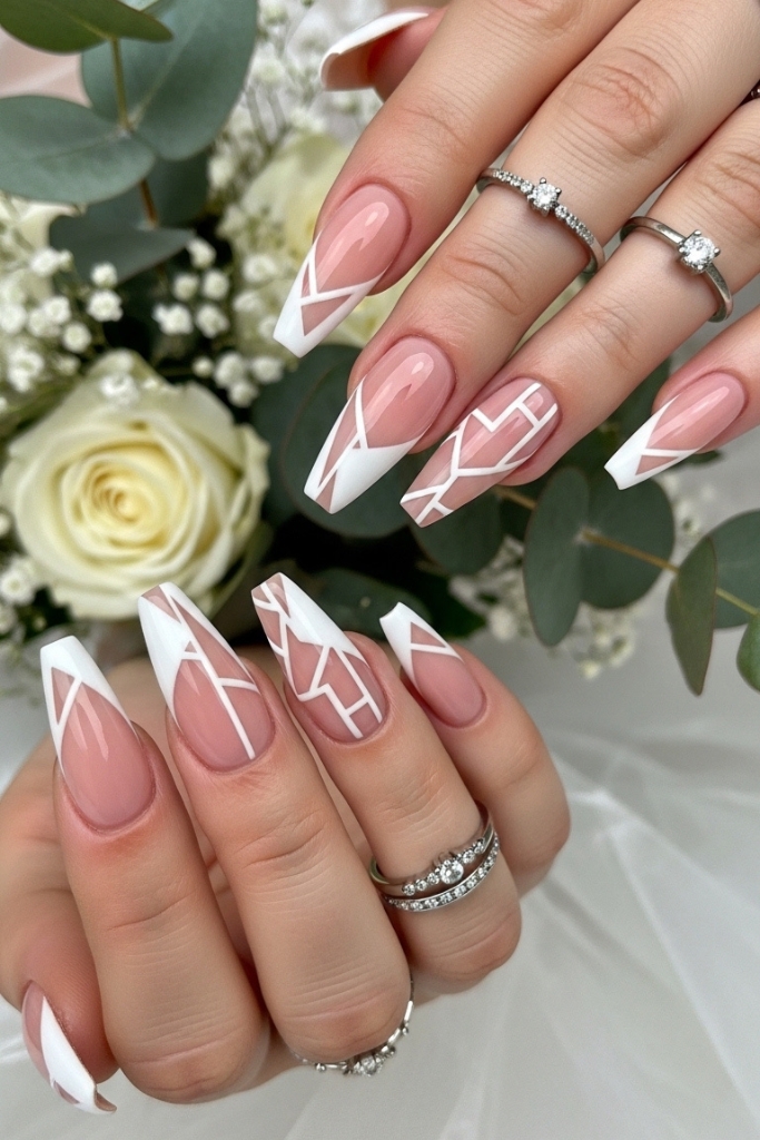 Modern French nails explore shapes like stiletto or coffin with metallic lines, geometric tips, or minimalistic patterns. Nude or soft pink bases keep the design elegant. Brides, bridesmaids, and party-goers can embrace this style for unique, fashion-forward looks. French manicure acrylic nails for weddings in modern designs are perfect for bold, stylish statements while remaining sophisticated. They merge traditional French elegance with contemporary trends.