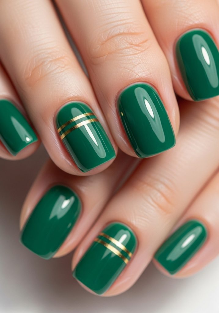 A single thin gold line on one or two nails takes a solid jade manicure from nice to really intentional. Use a gold striping brush or a thin nail art brush dipped in gold gel polish. You can do it horizontally near the cuticle, diagonally across the nail, or even as a curved arc near the tip. Whichever direction you go, keep it to one line per nail. That’s what makes it look clean and editorial rather than busy. Seal it well because thin line details can chip at the edges.